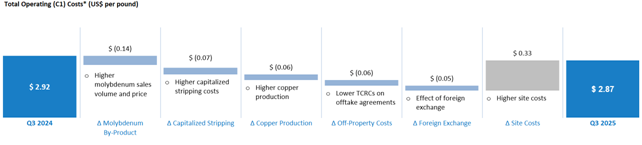 Total operating (C1) costs* were US$2.87 per pound of copper produced for the third quarter compared to US$2.92 per pound of copper produced for the prior comparative quarter. The decrease in total operating (C1) costs was primarily attributable to higher molybdenum by-product credits, higher capitalized stripping costs, slightly higher copper production, and lower off-property costs partially offset by higher mining rates as outlined in the bridge graph below: