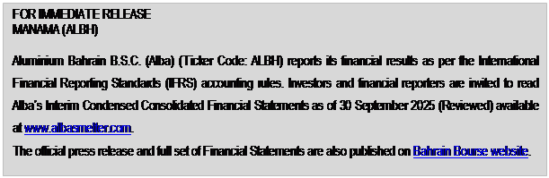 Manama, Bahrain - [11 November 2025]: Aluminium Bahrain B.S.C. (Alba) (Ticker Code: ALBH), the world's largest aluminium smelter on one site, has reported a Profit of BD67.3 million (US$179 million) for the third quarter of 2025, up by 23% Year-over-Year (YoY), versus a Profit of BD54.5 million (US$145 million) for the same period in 2024. The Company reported Basic and Diluted Earnings per Share of fils 48 for Q3 2025 versus Basic and Diluted Earnings per Share of fils 39 for the same period in 2024. The Total Comprehensive Income for Q3 2025 stood at BD67.5 million (US$179.4 million) versus Total Comprehensive Income for the third quarter of 2024 of BD51 million (US$135.6 million) - up by 32% YoY. Gross Profit for Q3 2025 was BD98 million (US$260.8 million) versus BD80.5 million (US$214 million) for the same period in 2024 - up by 22% YoY. With regards to the Revenue from contracts with customers in Q3 2025, Alba generated BD449.4 million (US$1,195.3 million) versus BD433.5 million (US$1,152.8 million) in Q3 2024 - up by 4% YoY.