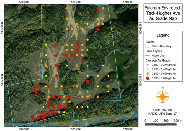 The auger drill programme provides detailed mineralogical data to support a Mineral Resource Estimate ("MRE"), which will be the key step to advance the Teck Hughes project towards production. Photon gold and ICP-MS Ultratrace 4 multi-element have been returned for 94 augur drill holes to date. Incorporating gold, silver, tellurium and gallium only, the best gold equivalent assay results are 1.68g/t AuEq over 0.8 metres, best hole results of 1.08g/t AuEq over 4.75 metres from surface and the deepest hole measured is 12.4 metres. Final samples for the remaining 65 auger holes are at Actlab for comparative Gold Fire Assay and ICP-MS Ultratrace 4 multi-element assay. Following the completion of phase 3 testing with Extrakt, Fulcrum will review any further potentially economically recoverable minerals.