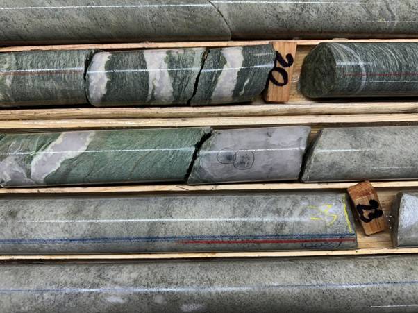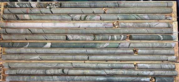 Figure 3 boxes of core from drill hole SUN-26-06, drilled on an azimuth of 200o, in order to test the plunge of the mineralsied structure. It shows the mineralised 'package' of altered (variously quartz veined) tonalite on the margins of deformed chloritic schist containing / alternating with quartz veins and veinlets. This hole contains two separate occurrences of VG.
