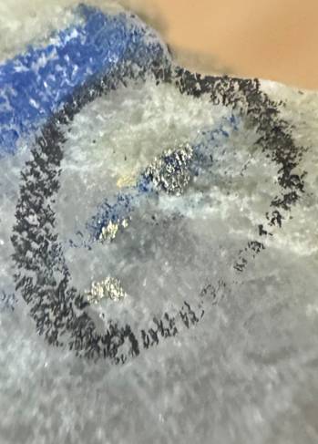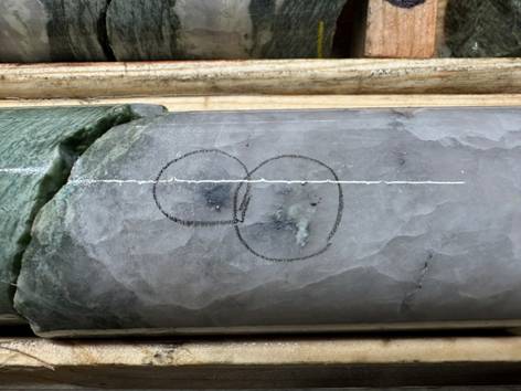 The observation of further visible gold in the core in two separated locations is extremely significant, see Figure 4-8.The gold grains are scattered throughout a small area of the quartz vein and again associated with galena.