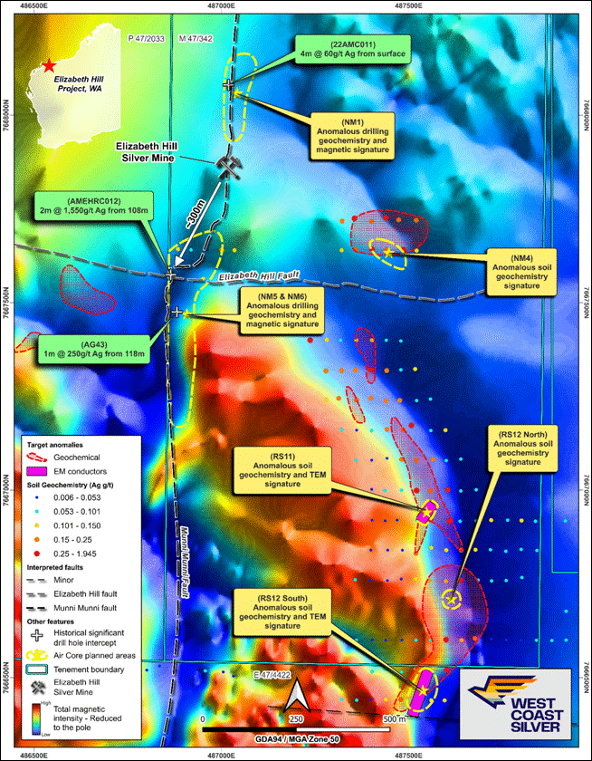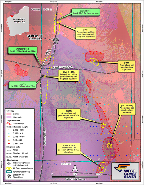 West Coast Silver Limited (ASX: WCE) West Coast or the Company has commenced a ~2,500m aircore program at the Elizabeth Hill Silver Project Elizabeth Hill, to define targets surrounding the historical mine and along the eastern Munni Munni margin. The program follows completion of a 1,015m Phase 2 diamond campaign at Elizabeth Hill (testing near-surface high-grade mineralisation, and prospective areas at depth below historical workings), that intersected visible native silver2, for which assays are pending.