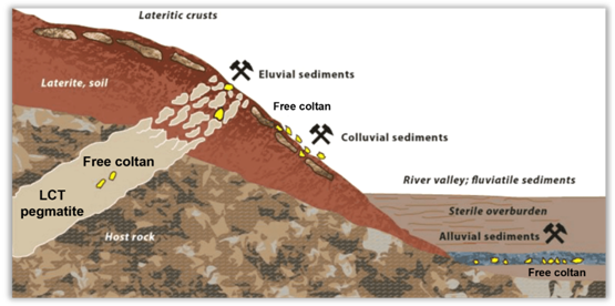 Due to their heavy nature, minerals such as tantalum-rich coltan are often deposited in high concentrations in drainage basins by gravity (see Figure 1). Located near mineralised pegmatites which are weathered over time, these alluvial basins are tangible resource targets.