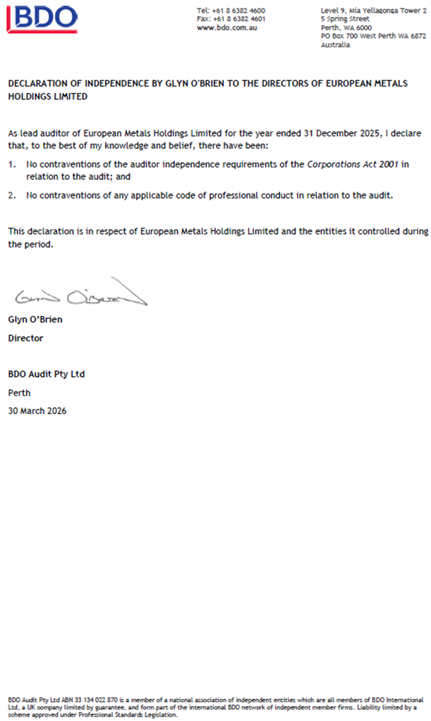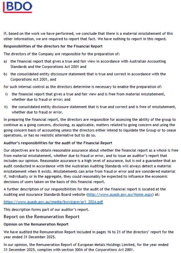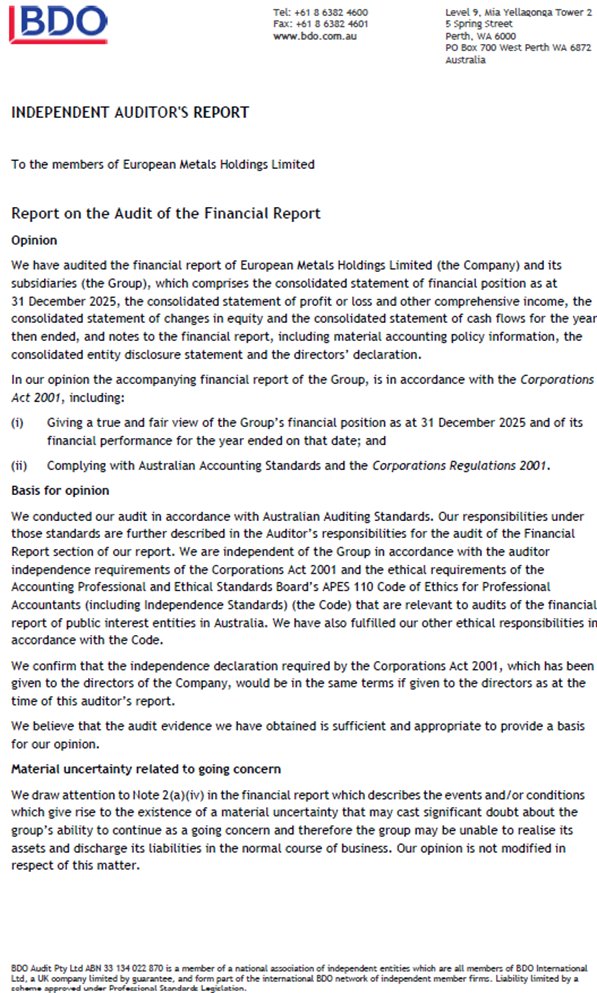 European Metals Holdings Limited (ASX & AIM: EMH, OTCQX and OTCQB: EMHXY and EMHLF) ("European Metals" or the "Company") are pleased to announce the Company's Annual results for the year ended 31 December 2025.