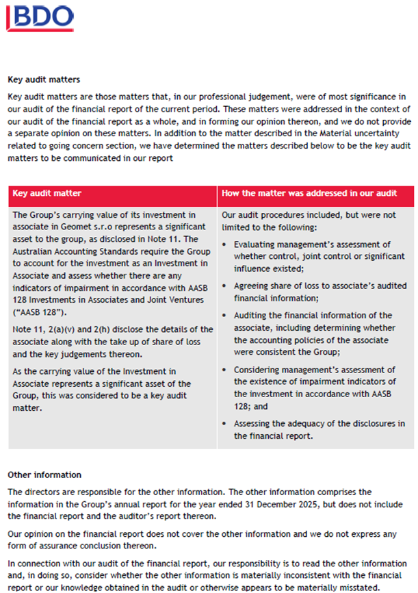 In November 2025 the Company announced that, subject to completion of administrative processes, Geomet s.r.o. had been informed of the award of a grant of up to EUR360 million (AU$645 million) under the "Strategic Investments for a Climate-Neutral Economy" programme (the "Programme"), administered by the Ministry of Industry and Trade of the Czech Republic for the development of the Company's Cinovec Project.