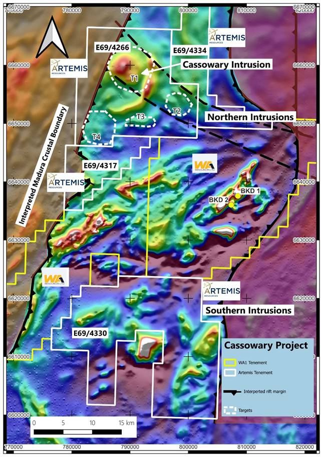 The Cassowary Project includes several intrusions interpreted within a >30km wide rift zone bounded to the west by >500km long Madura Crustal Boundary. (Refer Figures 1 & 2).