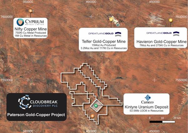 Tom Evans, Cloudbreak's MD, commented; "I am excited and delighted we have been able to proceed with this fantastic opportunity to acquire this asset, in a jurisdiction with significant activity and recent proven success by Wishbone Gold Plc. Located only 40km southwest of the Telfer Gold-Copper Mine operated by Greatland Gold Plc.