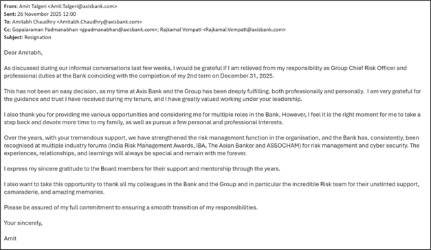 b) Amit Talgeri will cease to be the Chief Risk Officer upon completion of his 2nd term, with effect from close of business hours of December 31, 2025, and will be relieved from the services of the Bank at the close of business hours of January 18, 2026. Letter of resignation is attached herewith as Annexure B