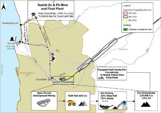 Prior to receiving a Mining Licence for the Hope and Gorob Project, the Company considered a number of possible mineral processing alternatives for run of mine ore. Using the NLZM Processing Plant was selected as a viable option subject to modification of the NLZM Processing Plant to make it better suited to copper - gold preconcentrate treatment. After detailed evaluation and an audit conducted by an external technical expert, the Company's Directors selected using the NLZM Processing Plant located approximately 190 km from the Hope and Gorob Project, (which until 2020 was used by NLZM for processing lead and zinc from its NLZM Project) as the preferred development option for the processing of preconcentrate that will be trucked from the Hope and Gorob Project to the NLZM Processing Plant.