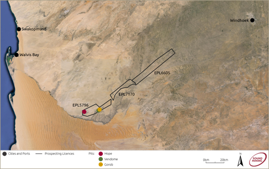 The Hope and Gorob Project lies approximately 250km southwest of Namibia's capital, Windhoek, and 120km southeast of the country's main port, Walvis Bay and includes three main orebodies: Hope, Vendome, and Gorob together with numerous other recognised targets whose locations are shown in Figure 2.