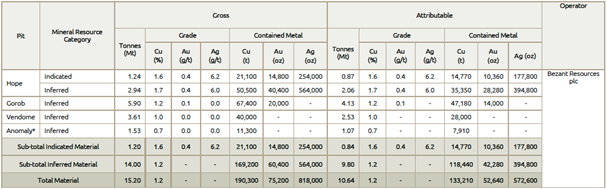 Indicated and Inferred Mineral Resource Estimate for the Hope and Gorob Project, Namibia. Gross representing 100% estimated Resources - Bezant has a 70% interest in the Hope and Gorob Project