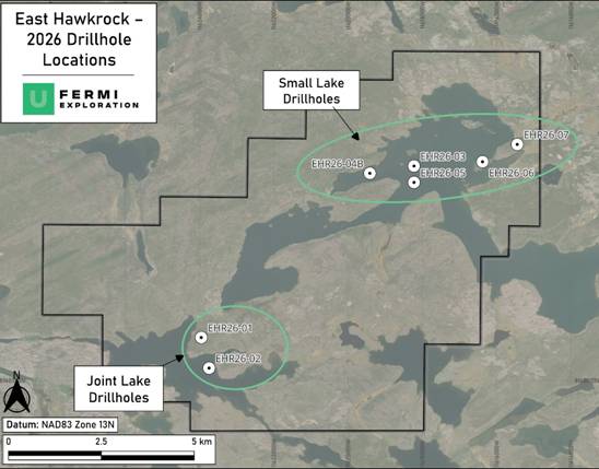 As shown in Figure 1, diamond drill holes ("DDHs") EHR26-01 and EHR26-02 were drilled in the Joint Lake Target Area, to the southwest of the property, while DDHs EHR26-03 to EHR26-007 were drilled in the Small Lake Target Area, to the north and northeast of the Property. The drill collar coordinates are provided in Table 1 below.