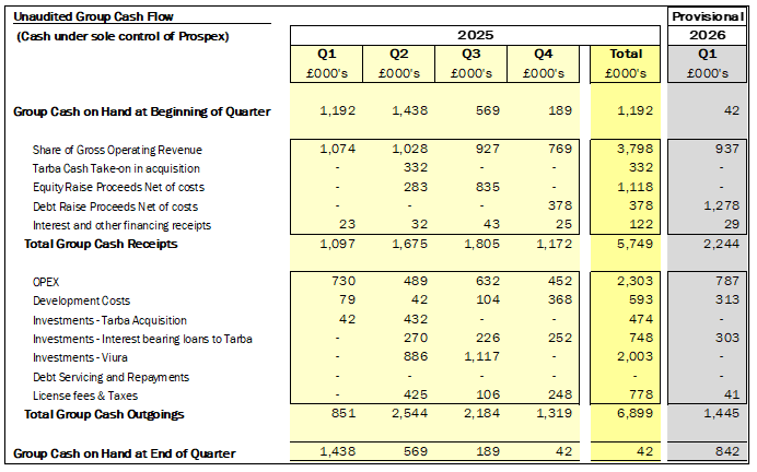 The presentation includes an unaudited cash reconciliation for calendar year 2025 and an indicative estimate for Q1 2026 which takes account of cash directly controlled by the Company but excludes cash flows related to its 7.5% ownership stake in HEYCO Energy Iberia corresponding to the Viura field.