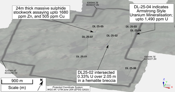 · Mineralisation along strike of the Armstrong Deposit confirmed at the Northeast Target; DL25-04 returned 1,490 ppm U (0.15% U), plus elevated vanadium and zinc.