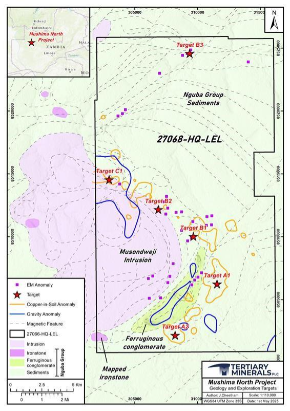 Figure 1. Geological map of the Mushima North Project showing the locations of the priority targets within the licence.
