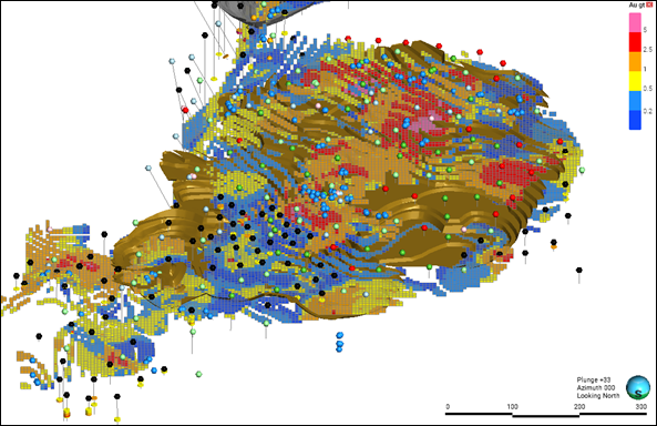 Figure 3: 3D view of Tavşan Main and South Zone showing 2025 drilling within and around the currently planned pits. The March 2024 block model is shown, coloured on the same scale as the assay results. Parts of the Main Zone have been mined already, as can be seen by blocks sitting above the topography (gold colour). Drilling and assays are only shown for 2025 for simplicity and only intercepts greater than 0.5g/t Au are shown.