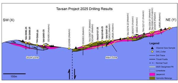 Figure 4: Northeast-southwest cross-section through Tavşan Main and South Zones, highlighting key 2025 drill intercepts and the geological interpretation for an approximate 50m swath.