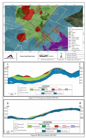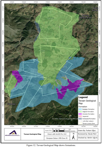 Geology | · Deposit type, geological setting and style of mineralisation. | · The property is located in the Izmir-Ankara suture zone in north-western Anatolia. The formations present span from Jurassic to Tertiary and typically comprise metamorphosed sedimentary sequences, displaying intense compressional tectonic features. · The Property includes an upper thrust plate of Late Cretaceous ophiolitic rocks (Dagardi Melange), jasperoid gold-bearing silicification along the thrust surface and a footwall of Jurassic-Cretaceous Budagan Formation massive, a massive micritic limestone. · Through the summer of 2022, the Ariana team completed remapping of the Tavşan license area to 1:2,000 and 1:5,000 scale (See Diagrams). |