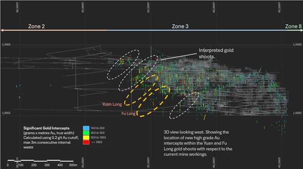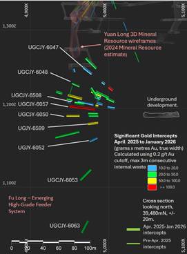 Figure 2: Long section looking west. Location of Yuan and Fu Long high-grade gold shoots and April 2025 to January 2026 significant intercepts with respect to current mine development at Caijiaying and previous high grade gold drilling intercepts.