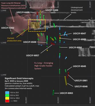Figure 2: Long section looking west. Location of Yuan and Fu Long high-grade gold shoots and April 2025 to January 2026 significant intercepts with respect to current mine development at Caijiaying and previous high grade gold drilling intercepts.