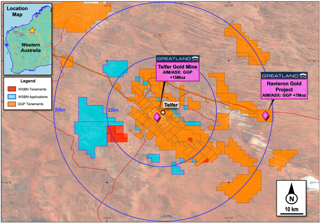 Figure 2: WSBN Red Setter Project (Red) and Exploration Tenement applications (Blue) immediately surrounding the Telfer Mine.