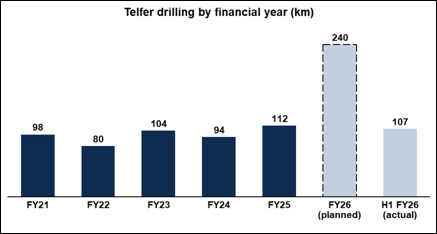 Greatland remains on track to complete the largest annual drilling program in Telfer's operating history, with ~240,000 metres total drilling planned in FY26, comprising ~150,000m of resource growth drilling and ~90,000m of resource conversion drilling.