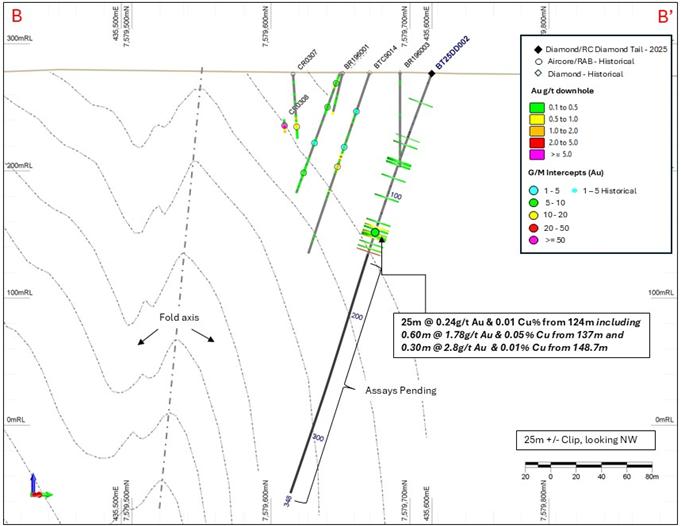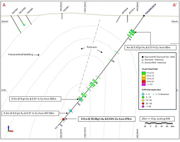 § Assay results were received for the remaining holes in the Thomsons deposit extension drill program, identifying down dip mineralisation and east west orientated high-grade veins aligned subparallel to previous drilling, with a peak of 0.62m @ 35.06g/t Au & 0.04% Cu from 478m THO25RCD014.