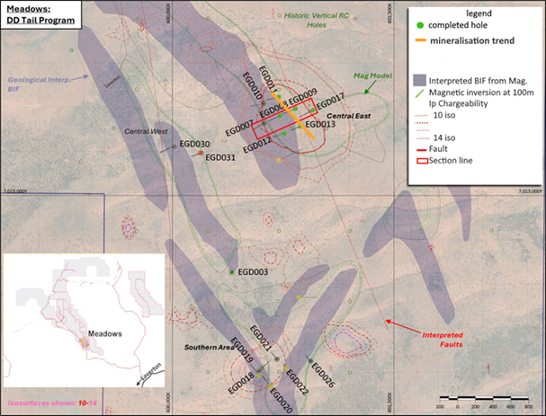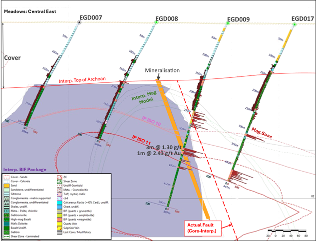 § Ernest Giles first pass testing of Induced Polarity (IP) anomalies was completed with diamond drillhole tails. Peak gold mineralisation was recorded in drillhole EGD009, with mineralisation open along strike and up and down dip: