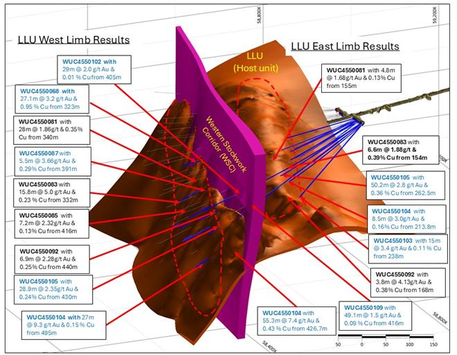 - 50.2m @ 2.8 g/t Au & 0.36 % Cu (141gm) from 263m (WUC4550105)