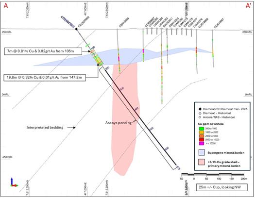§ 42m @ 0.8 g/t Au & 0.21 % Cu (35 gm) from 159m (WR39219)