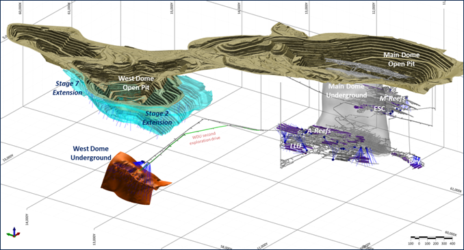 § 11 holes for 6,284m drilled during the quarter at the West Dome Underground (WDU) project, with further exceptional drilling results continuing to grow the scale of the opportunity.