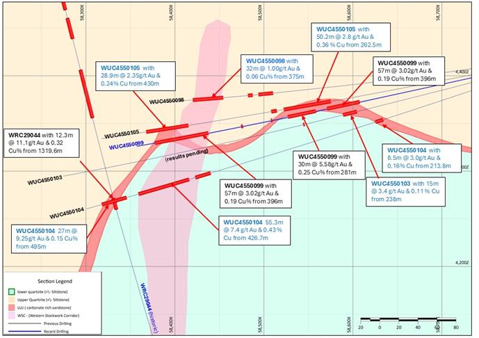 - 27.1m @ 3.2 g/t Au & 0.95 % Cu (87gm) from 323m (WUC4550068)