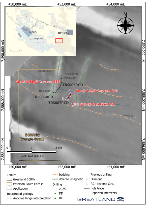 § Paterson South Farm-In drill testing was completed at the Teague prospect, approximately 35km east-southeast of Telfer. Highly encouraging gold and pathfinder element mineralisation was intersected in hole TRS007RCD: