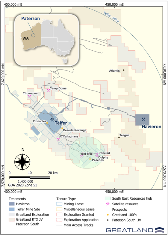 Mineral tenement and land tenure status | Prospect Tenement Location The following tenements are 100% owned by Greatland and Greatland Exploration Pty Ltd: · Thomsons M 45/10 · Camp Dome E 45/3261 · Big Tree M 45/400 · O'Callaghans M 45/203 · Ernest Giles E38/2205 The following tenements are the subject of an unincorporated joint venture (Paterson South Joint Venture) between Rio Tinto Exploration Pty Limited (RTX) (49%) and Greatland Paterson South Pty Ltd (51%). Pursuant to the farm-in arrangements, Greatland may earn up to a 75% interest in: · Triangle Teague - E45/5532 · Budjidowns - Atlantis - E45/4815 The Paterson tenements are subject to Land Access Agreements with Greatland and Jamukurnu-Yapalikurnu Aboriginal Corporation (JYAC) which has been in place since December 2015. The Ernest Giles tenements are subject to Land Access Agreements with Greatland and the Wakamurru AC (RNTBC) which has been in place since August 2023. |