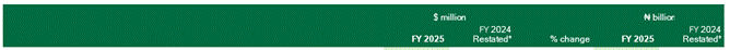 * Comparative figures for FY 2024 which includes 19 days consolidation of Seplat Offshore has been restated to align the final PPA valuation after completion of the final details of the acquisition of MPNU during the one year measurement period as permitted by IFRS 3 (Business combinations) and as a result recognised the final fair values of assets acquired and liabilities.
