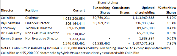 The table below shows the current shareholdings of Directors and their associates and their shareholdings after the issue of the Fundraising Shares and the Consultant Shares