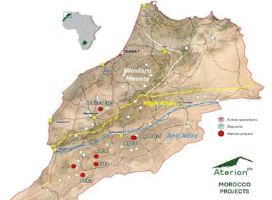 Aterian has a portfolio of multiple copper-silver (+gold) and base-metal projects in Morocco. Aterian holds a 90% interest in Atlantis Metals, a private Botswana-registered company holding eleven mineral prospecting licences for copper-silver in the world-renowned Kalahari Copperbelt and three for lithium and salt brine exploration in the Makgadikgadi Pans region. The Company also holds an exploration licence in southern Rwanda, where it is evaluating the tantalum and niobium opportunity, in addition to further exploring for pegmatite-hosted lithium.