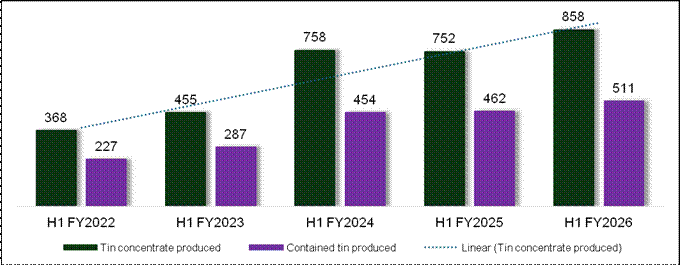 · Tin concentrate: increased 14% YoY to 858 tonnes (H1 FY2025: 752 tonnes).