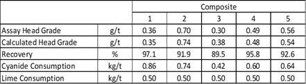 The Column Leach Test Results Completed by Intertek on bulk samples of plus 30kg 10mm crush size samples leached over a 90-day period (Table 2) showed an overall performance of: