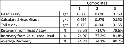 Bottle roll tests for CIL leaching Tests incorporating a 2-hour Oxygen Conditioning have achieved excellent results (Table 1):