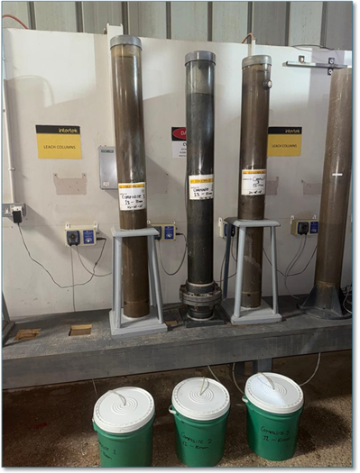 30kg of the crushed 10mm sample is agglomerated if required using 10kg/t cement, tumbled in a cement mixer, and allowed to cure for 5 days. The cured sample is loaded into a column gently, with the column at an angle to prevent packing. The initial height is marked and recorded. Photo below showing the test leach columns: