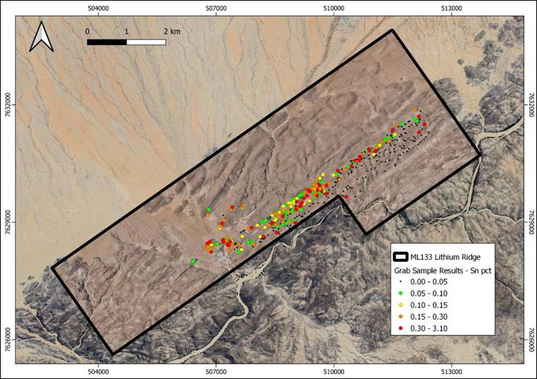 Figure 2: Sn grades in grab samples reported to date on Lithium Ridge