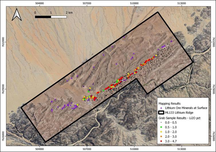 Figure 1: Li2O grades in grab samples reported to date, with visually identified lithium ore minerals at mapping sites on Lithium Ridge