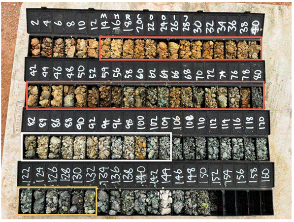Figure 1: Chip trays from MHRC0017 where copper oxides are visually present from 14m to 100m (orange = oxide, white = transitional and yellow = primary) and copper sulphides from 122m to 132m. Porphyry type, quartz monzonite dykes were intersected at 90-98m and 142-144m.