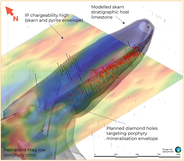 The IP survey will seek to validate our interpretation of the structure hosting skarn mineralisation and improve the targeting of the porphyry system. Drilling will target scale upside of the existing skarn mineralisation and look to test for depth extensions of previous high-grade intersections.