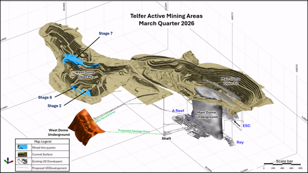 The Company announced an updated Telfer Mineral Resource Estimate (MRE) (as at 31 December 2025) on 30 March 2026, with Telfer resources growing by 4.8Moz to 419Mt @ 0.59g/t Au & 0.09% Cu for 8.0Moz Au & 370kt Cu, at a discovery cost of $5/oz. Higher confidence Measured and Indicated Telfer Resources grew 163% to 170Mt @ 0.69g/t Au & 0.13% Cu, for 3.8Moz & 249Kt Cu.