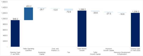 Cash flow from operations for the quarter was $453 million, with cash build of $260 million, for a closing cash balance on 31 March 2026 of $1,208 million.