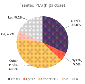 Rare Earth Element | Recovered PLS (mg/L) | % of TREO in PLS | % of TREO after 150% Low Dose | % of TREO after 300% Moderate Dose |