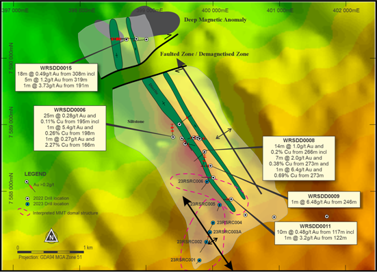 · 25m at 0.28g/t Au and 0.11% Cu from 195m in WRSDD0006 Including 1m at 5.4g/t Au and 0.26% Cu from 198m