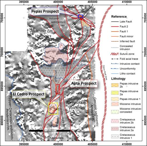 The El Cedro prospect lies to the south of the same integrated licence that hosts both Pepas and APTA and is roughly 4km south of the APTA base camp.